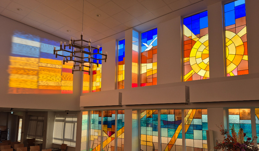 Het verpleeghuis Topaz Overduin in Katwijk aan Zee heeft glas-in-loodramen met het thema geloof, hoop en liefde. Deze drie waarden zijn terug te vinden in de vorm van het kruis, anker en hart. Het kleurrijke geheel heeft een Katwijkse sfeer: duinen, strand, een meeuw (of duif) in de lucht. De beelden hebben ook een universele betekenis. Water, lucht, aarde en vuur zijn al heel lang de vier bouwstenen van alles wat bestaat.
