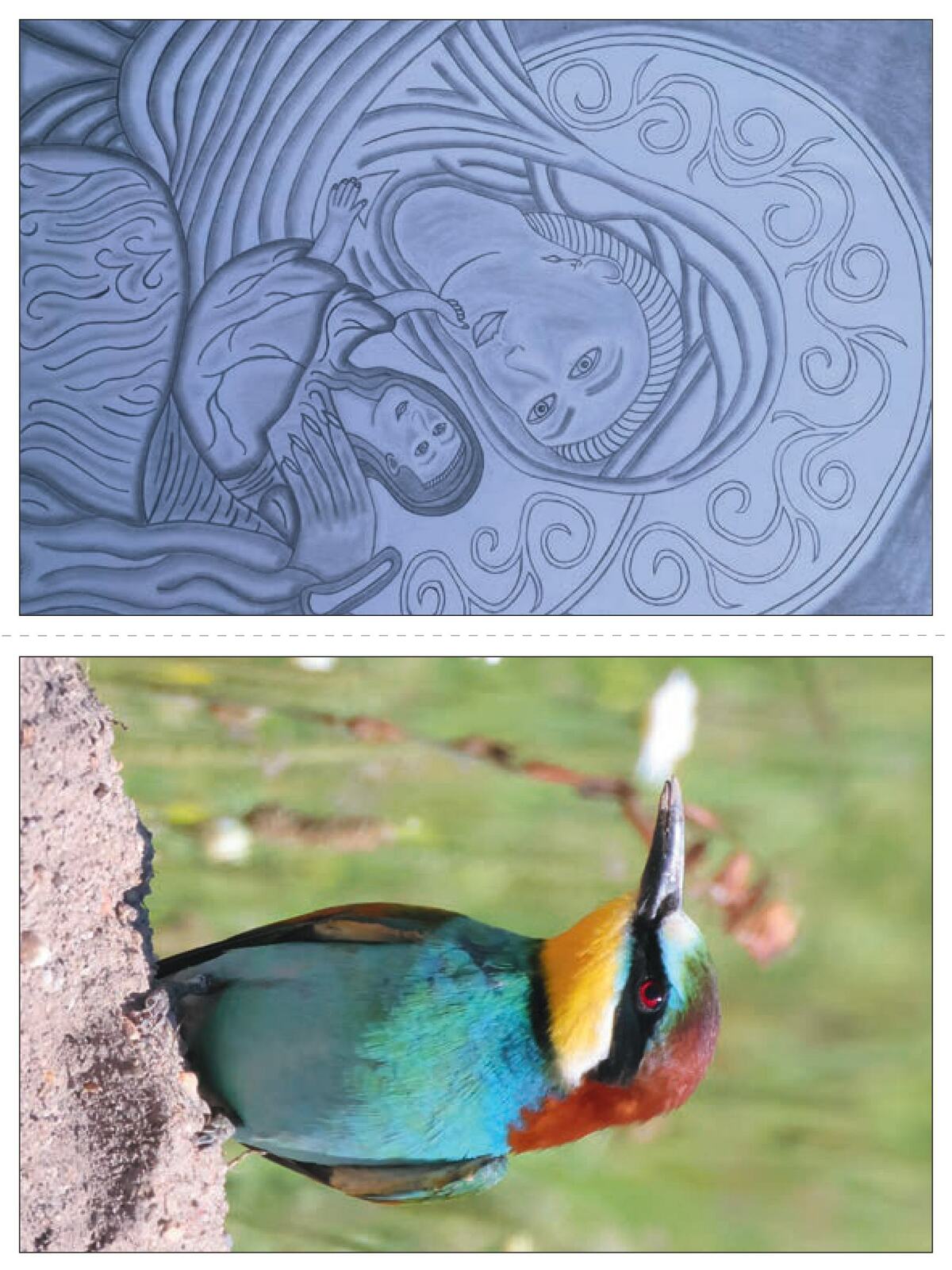 Kunstwerk (links) op de cover van de paasgroetenkaart 2026: 'Zoals deze moeder haar kind liefheeft en beschermt, zo houdt Jezus onvoorwaardelijk van ons. Hij droeg onze pijn, stierf aan het kruis en overwon de dood uit liefde voor ons.' Deze afbeelding is gemaakt door een gedetineerde in de PI Nieuwegein.